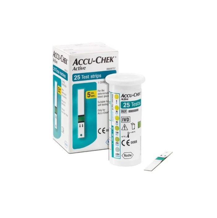 نوار تست قند خون اکیو چک مدل اکتیو 25 عددی محصولی اصل از کمپانی Roche آلمان است که برای دستگاه قند خون Accu-Chek Active طراحی شده است.