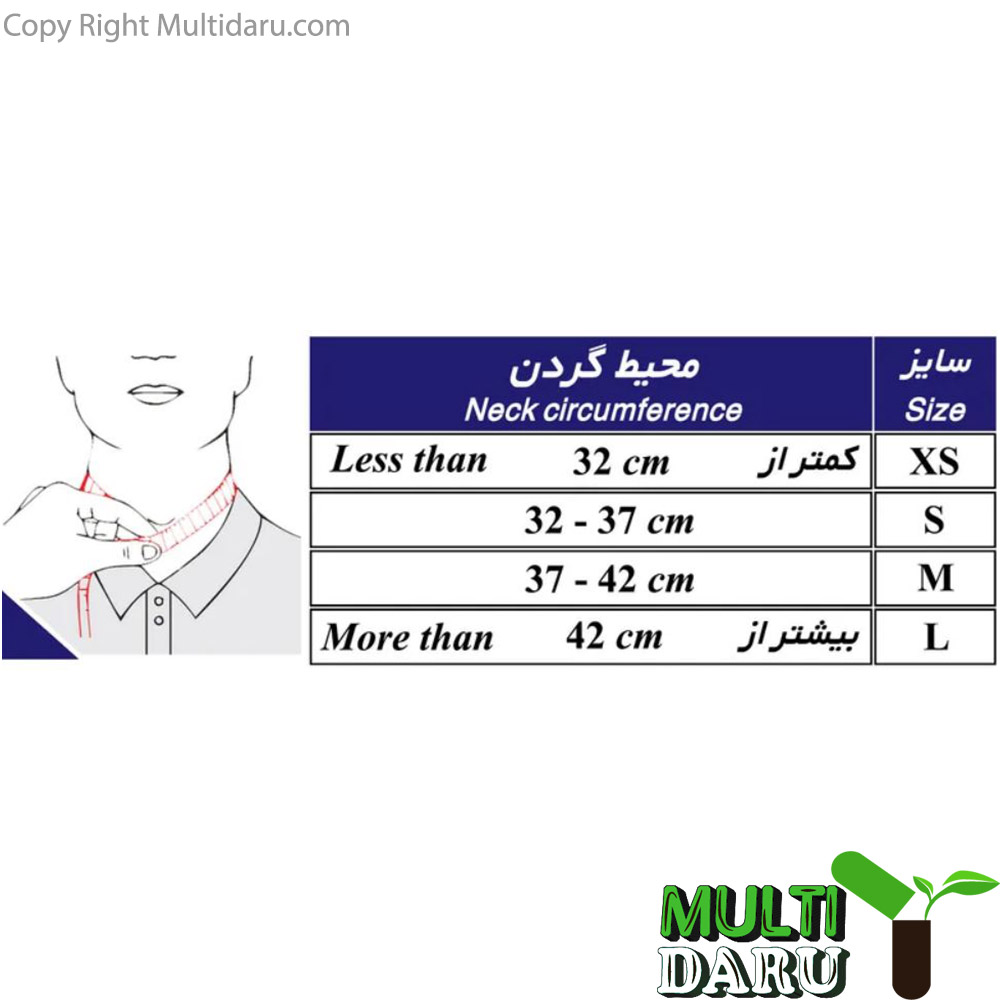 دارای چهار سایز مختلف براساس محیط گردن با قابلیت تنظیم ارتفاع و قابل استفاده برای همه افراد